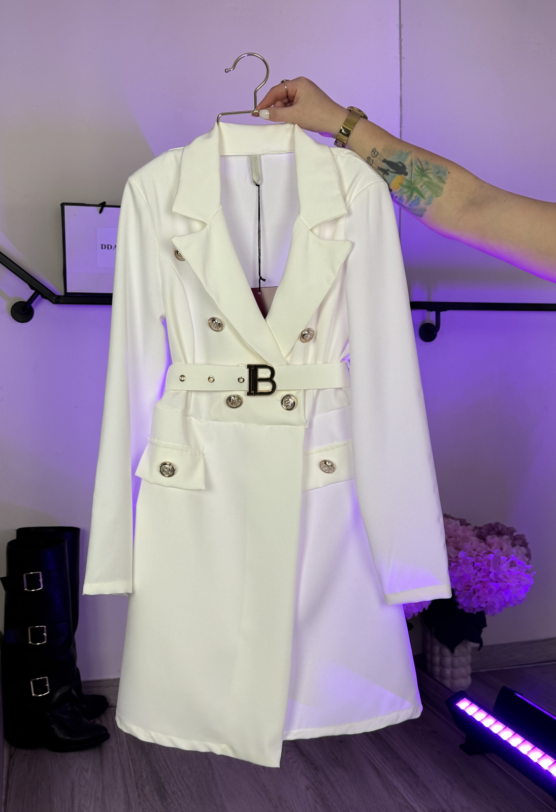 Croi tip sacou, talie evidențiată prin curea statement și detalii aurii elegante. O piesă sofisticată care îți conturează silueta și îți oferă un look premium, fără efort.
